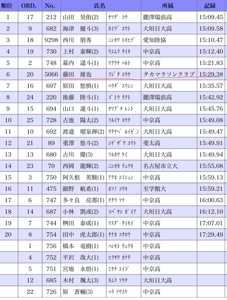 藤田 雄也 ・・ 15分29秒38