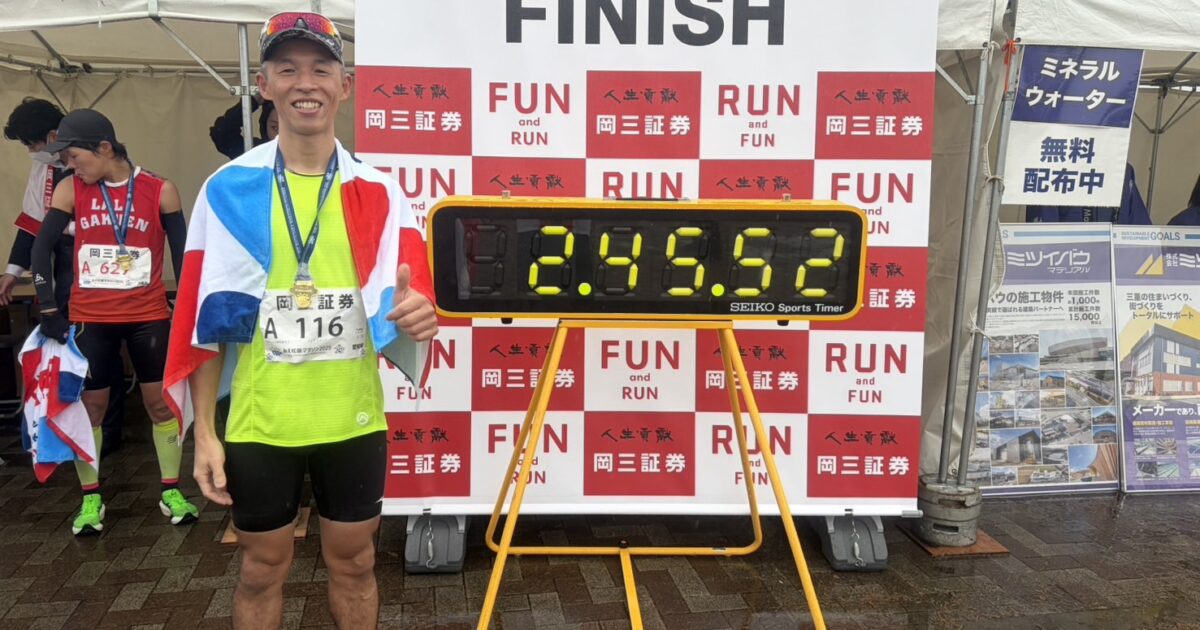 「35キロ過ぎから雨が強くなり少し寒さを感じペースが上げ切れなかったが、あとは想定どうり走れた」とのこと。