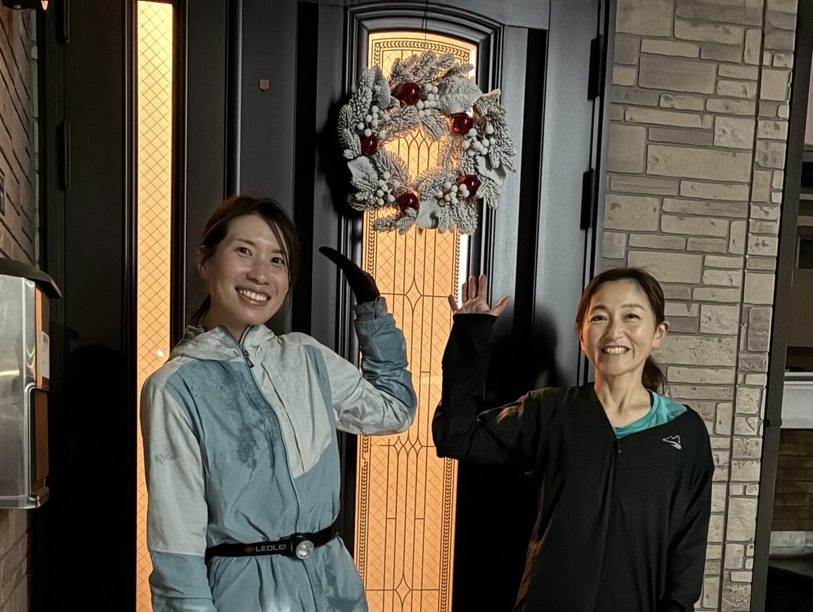 明日はクリスマスイブなので、クリスマスリースを前に10キロ走ったあとの二人を撮影、「すがすがしい笑顔」がとても良い。