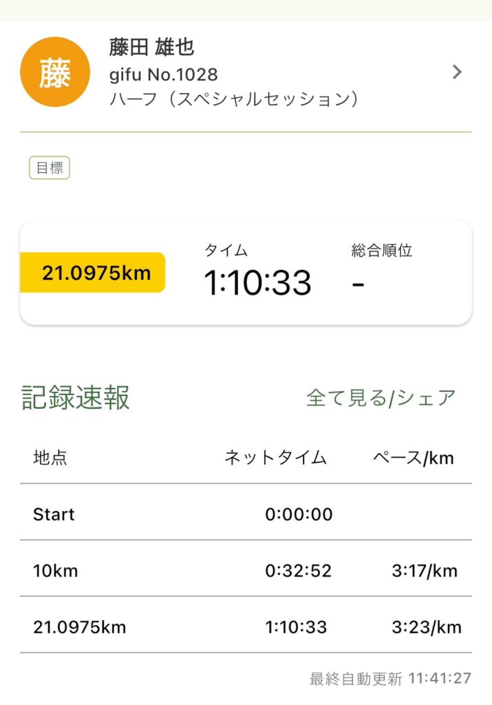 - 藤田 雄也 1時間10分37秒 PB更新(ネット 1:10:33)